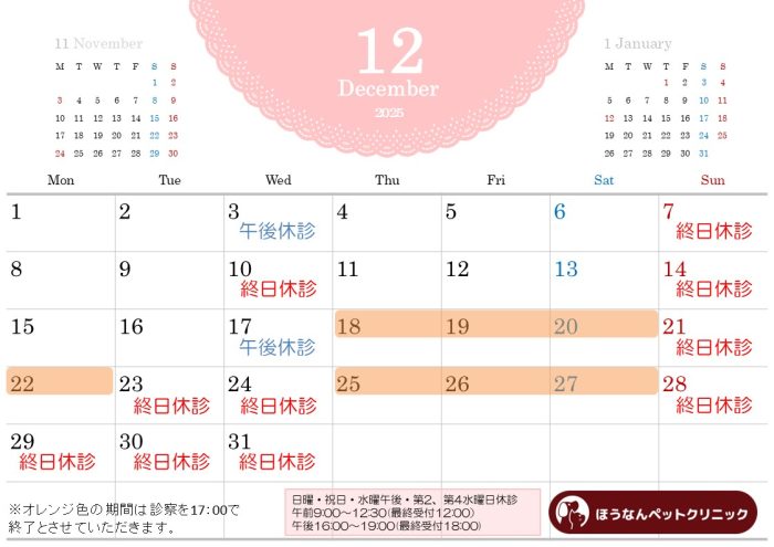 12月の診療のご案内 12月の診療のご案内 午後休診:3日(水)、17日(金) 終日休診:毎週日曜、10日(水)、23日(火)、24日(水)、29日(月)、30日(火)、31日(水) 都合により12/18~27の期間中、午後の診療は17:00までとさせていただきます。 みなさまにはご迷惑をおかけいたしますが、ご理解の程よろしくお願いいたします。 ※都合により診療日が変更になることがございますので、随時ホームページをご確認ください。 現在院内の密を避けるため、予約診療システムを導入しております。